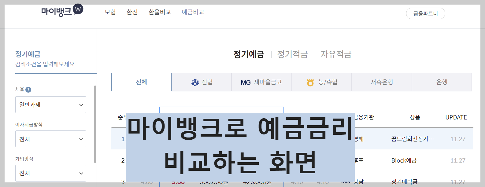간단한 방법은 바로 '마이뱅크'를 이용하는 방법입니다. '마이뱅크'를 이용하면 손쉽게 전 지역에 있는 새마을금고의 예금금리를 비교하고 가장 높은 곳을 확인할 수 있습니다. '마이뱅크'를 통해서 세율, 이자지급방식, 가입방식, 예치금액 등의 기준으로 이자를 간편히 볼 수 있습니다.
